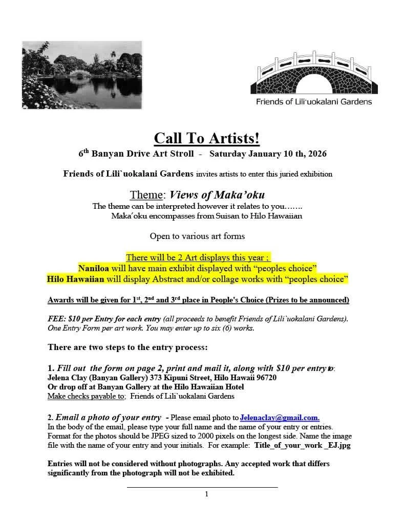 Submission deadline of entry forms for the Banyan Drive Art Stroll: deadline for email submission is 5:00 p.m. Details are in the “Call to Artists” available from Banyan Gallery in advance of this deadline.